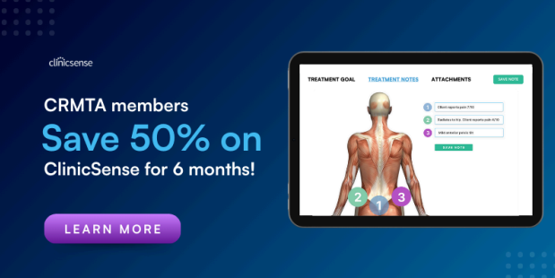 ClinicSense is offering CRMTA members 50% off for 6 months on any subscription plan! Find out why ClinicSense is loved by over 8,500 practitioners and rated #1 in ease-of-use!